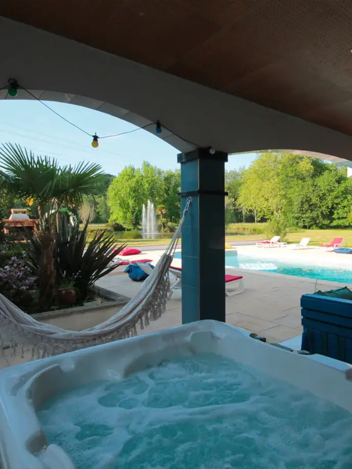 🏊 Accès libre aux équipements du lieu : piscine extérieure, jacuzzi, baby-foot, flipper, billard, parc naturel.
